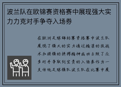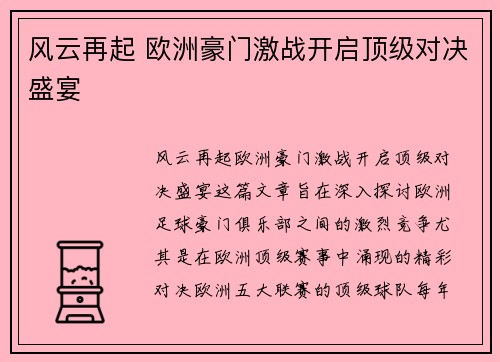 文章摘要:在欧洲冠军的争夺战中,各大豪门球队通过一场场紧张激烈的比赛不断碰撞与较量,展示了他们对冠军的渴望和追求。从战术布置到球员个人能力,再到球队的整体配合,比赛的每一个细节都充满了变数与激情。球队之间的竞争不仅仅是实力上的比拼,更是心理、策略、应变能力等多个层面的对决。在这场令人振奋的欧洲冠军争夺战中,球员们的表现、教练的智慧以及球迷的支持成为了关键因素。本篇文章将从四个方面详细分析欧洲冠军争...